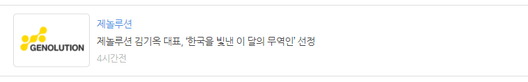 <2021-04-07> 체외진단기기 전문기업 제놀루션(225220) 김기옥 대표이사가 서울 강남구 삼성동 트레이드타워에서 개최한 ‘제135회 한국을 빛낸 이달의 무역인’ 행사에서 ‘이 달의 무역인’으로 선정됐다고 7일 밝혔다.