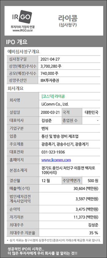 라이콤 [IPO] 라이콤 기업개요 - IRGO
