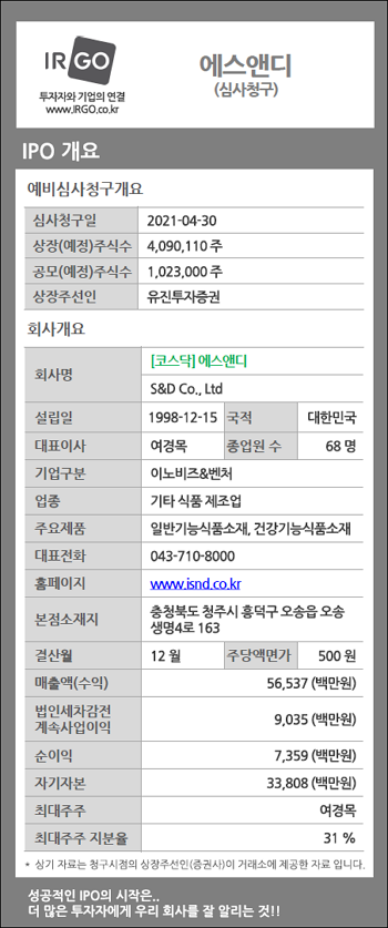 에스앤디는 자연 친화원료로 건강지향 소재를 추구하는 기타 식품 제조 기업입니다.