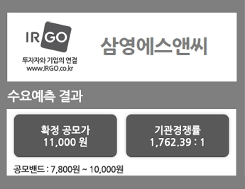 삼영에스앤씨가 수요예측에서 확정공모가 10,000원으로 무사히 수요예측을 마무리 하였습니다.