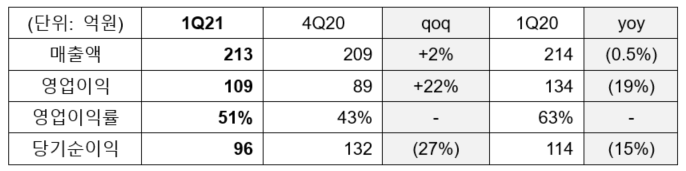 한편, 2021년 1분기 영업이익률은 51%로 연말 성과급과 일회성 지급수수료가 반영된 전분기 대비 증가되었다. 전년 동기 대비해서는 소폭 하락하였는데, 회사측은 기업 성장을 위한 연구개발 확대, 생산 인력 확충, 마케팅 강화 등 투자를 늘려가는 중이라고 밝혔다.