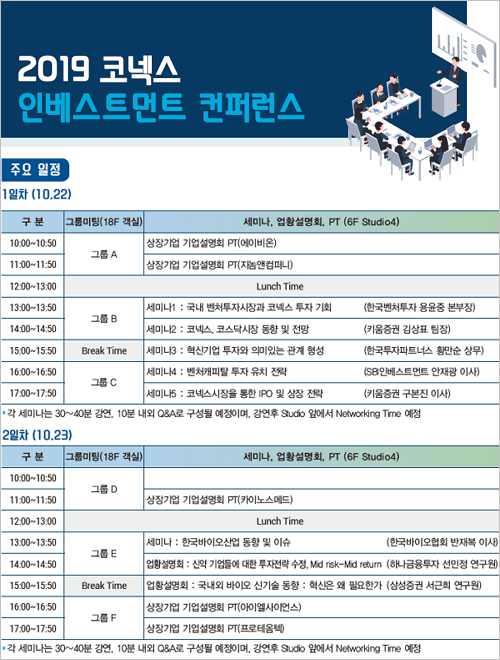 한국거래소(이사장 정지원)는 키움증권(대표이사 이현)과 공동으로 다가오는 10월22일(화)~10월23일(수) 「2019 코넥스 인베스트먼트 컨퍼런스」를 다음과 같이 개최하고자 하오니 투자자 분들의 많은 참석 부탁드립니다.