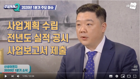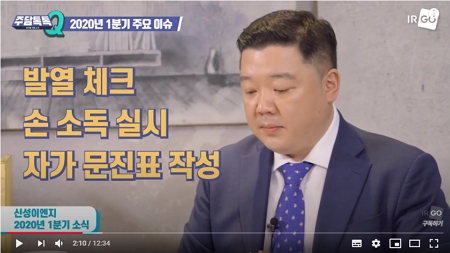 여러분들께 신성이엔지가 어떻게 COVID-19에 대응을 해왔으며, 올해 어떤 사업계획을 가지고 있는지, 또 1분기 동안 어떤 이슈들이 있었는지에 대해 알리고자, 부족하지만 하나씩 하나씩 내용들을 정리하여 영상으로 준비하였습니다.