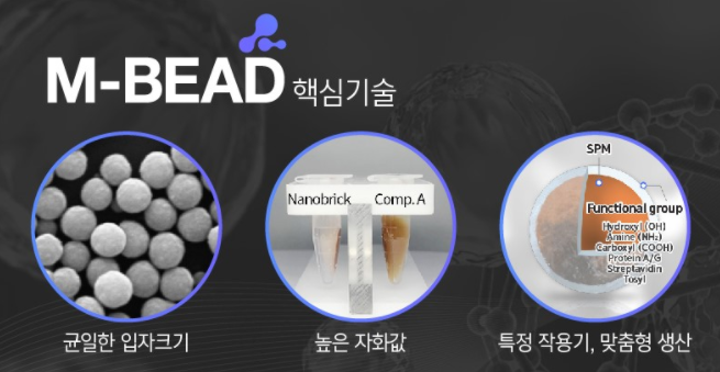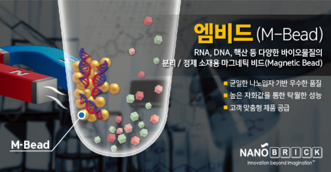 바이오 정제소재 '엠비드(M-Bead)'는 다양한 작용기가 코팅되어 있는 자성나노입자 제품으로, 특정 바이오 물질을 자석을 이용하여 선택적이고 빠르게 분리·정제할 수 있는 제품이다. 나노브릭은 검증된 나노플랫폼을 토대로 입자크기 및 품질이 균일한 엠비드를 대량생산하고 있으며, 국내 굴지의 진단키트 업체 및 미국, 캐나다 등 해외로 엠비드 공급을 확대해 가고 있다.