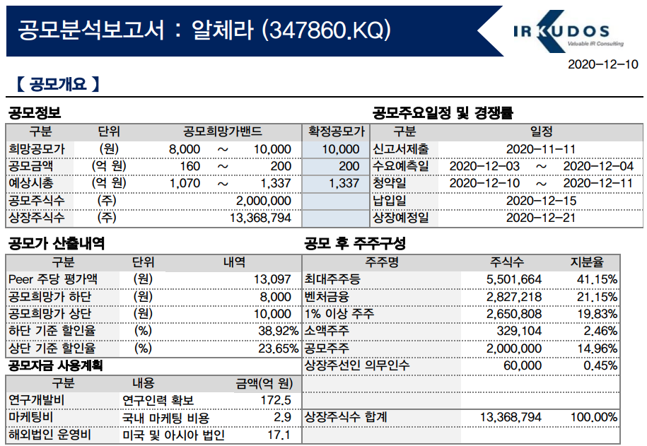 알체라 [알체라 IR팀] 정정 - 공모분석보고서가 공개되었습니다. - IRGO