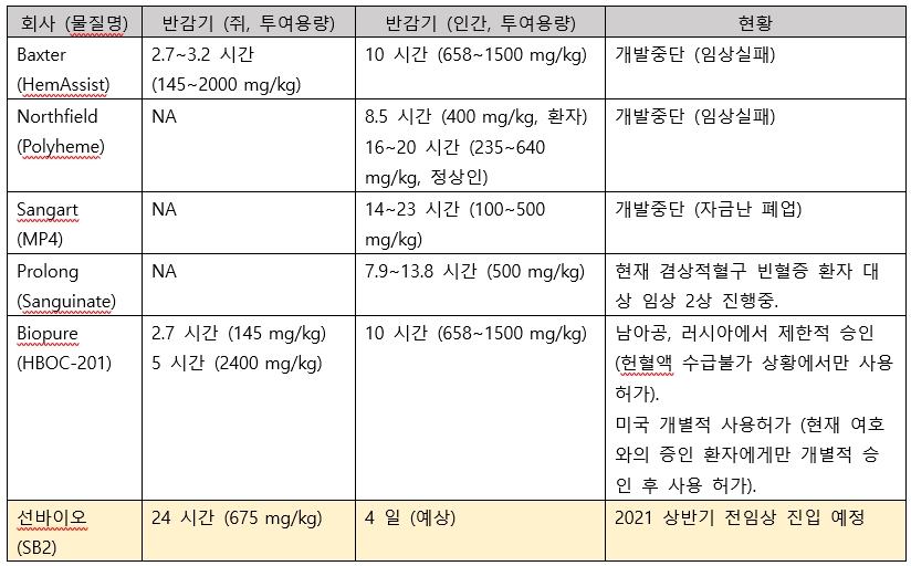 [타사 인공혈액 자료 인용: J. Funct. Biomater. 2017, 8, 11; doi:10.3390, Taguchi, K. et. Al., “Comparison of the Pharmacokinetic Properties of Hemoglobin-based Oxygen Carriers”. 위 표는 임상 자료가 존재하는 경우만 발췌하였습니다.]